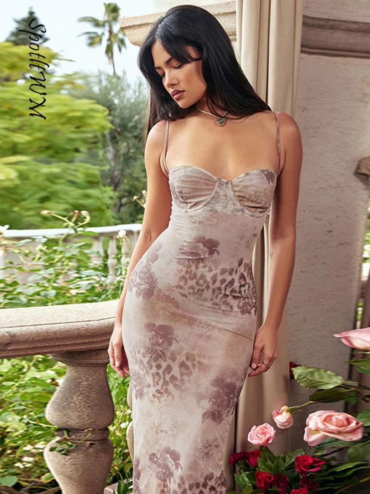 Long Sleeve Sheer Mesh Floral Print Casual Maxi Dress