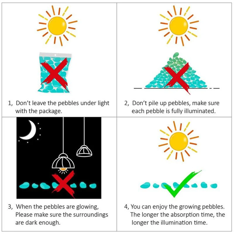 3.When the pebbles are glowing , please make sure the surroundings are dark enough .