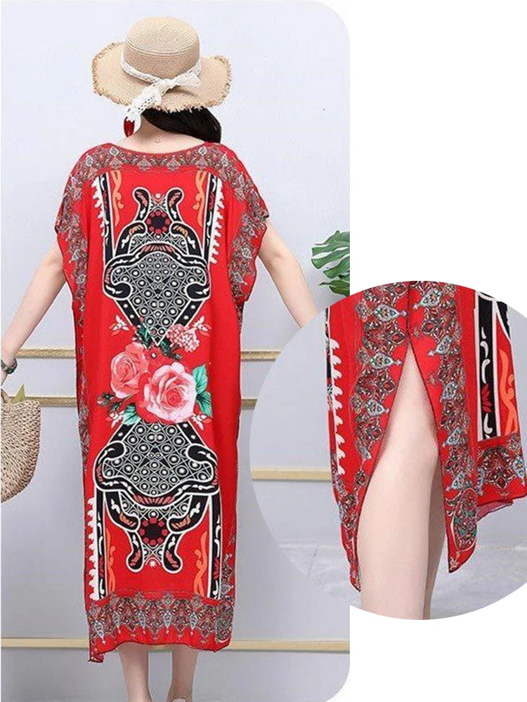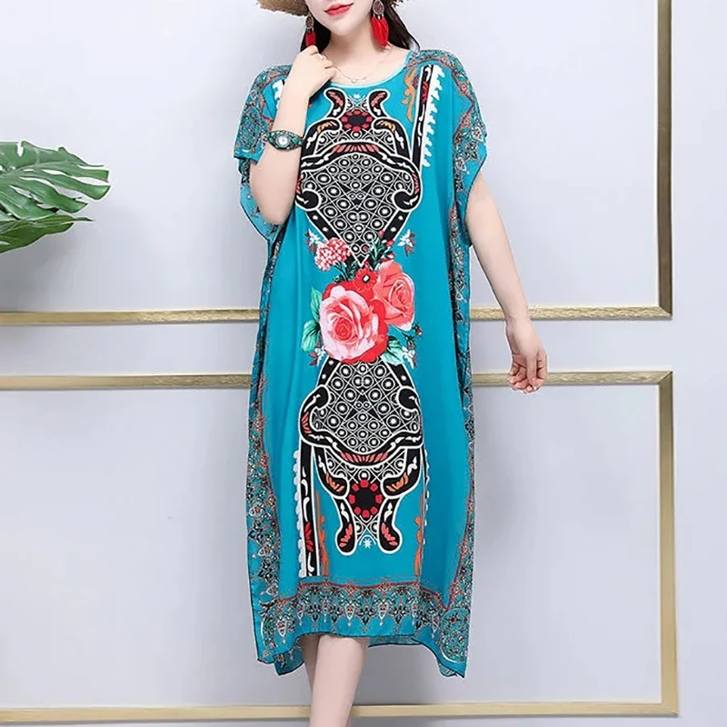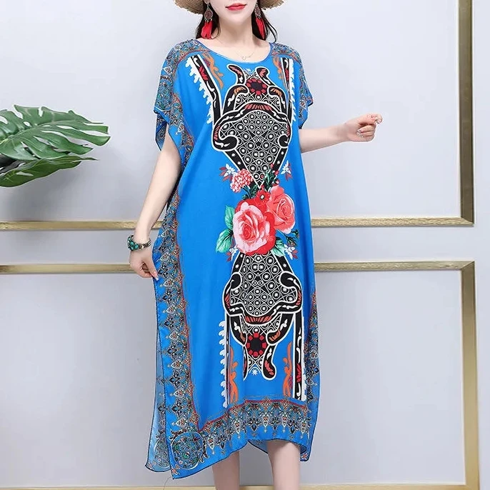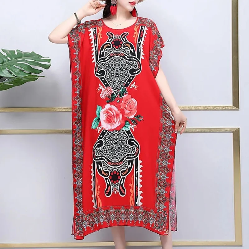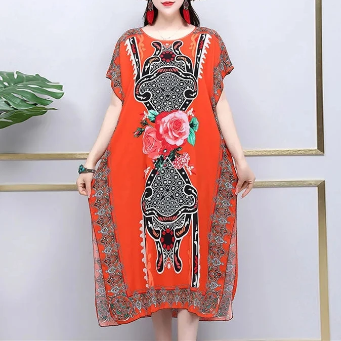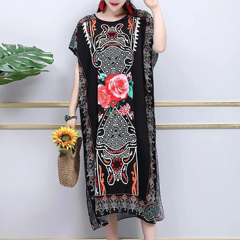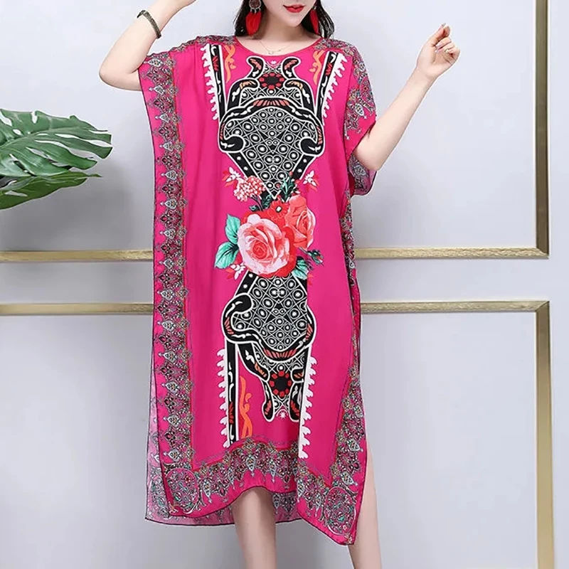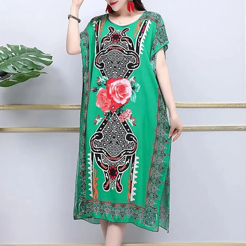 Casual Elegant Ethnic Style Retro Floral Round Neck Slit Straight Dress Summer Women's dress Midi dresses holiday dresses 2024