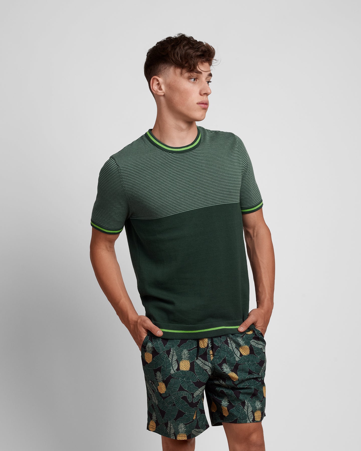 This retro-inspired multicolored short sleeve knit-tee puts a bold and unexpected twist on the classic striped sweater. This 100% cotton sweater features neon green stripes on a dark green background and contrast green on the collar waist and sleeves. It offers just the right balance of moisture-wicking and coolness during the Spring and Summer season.
