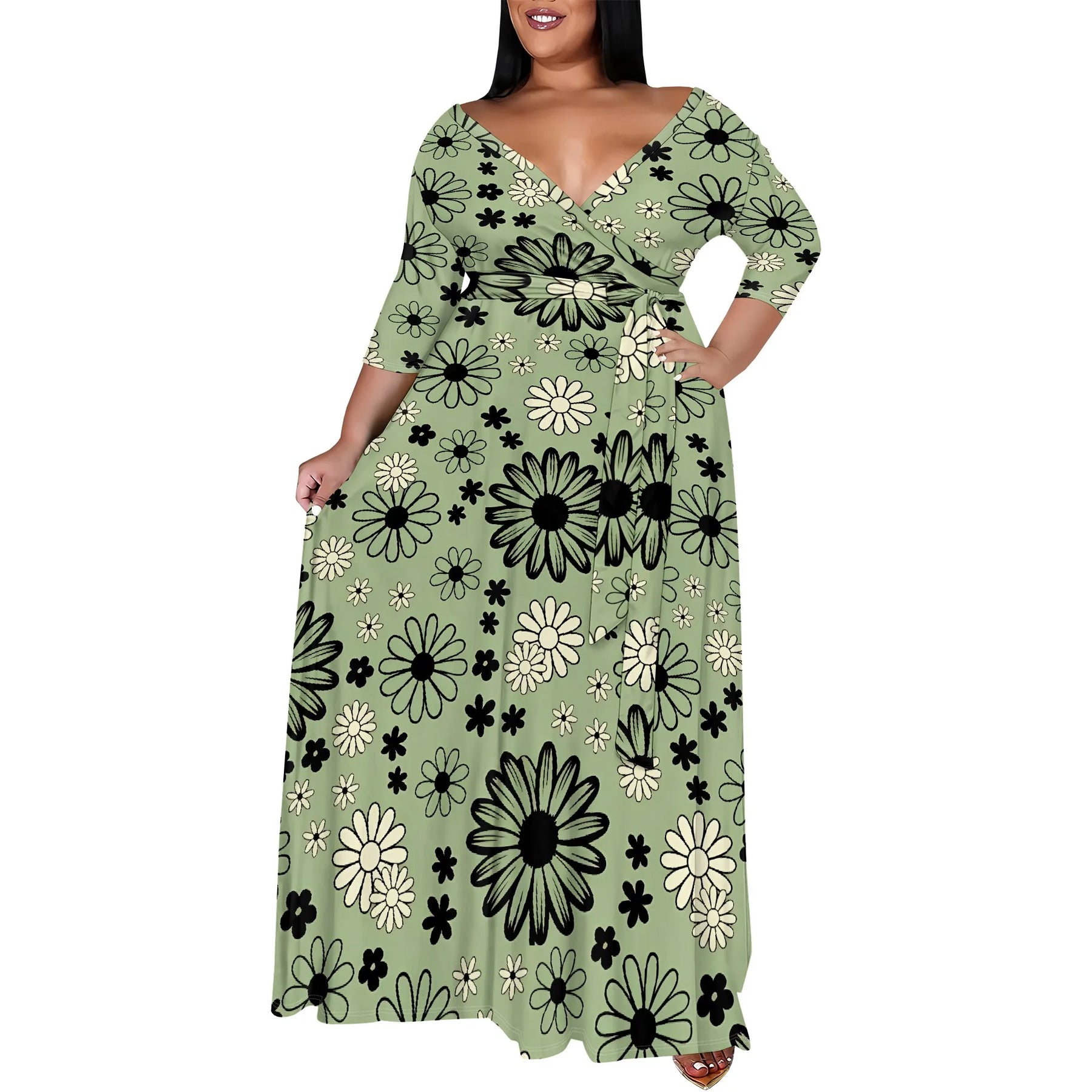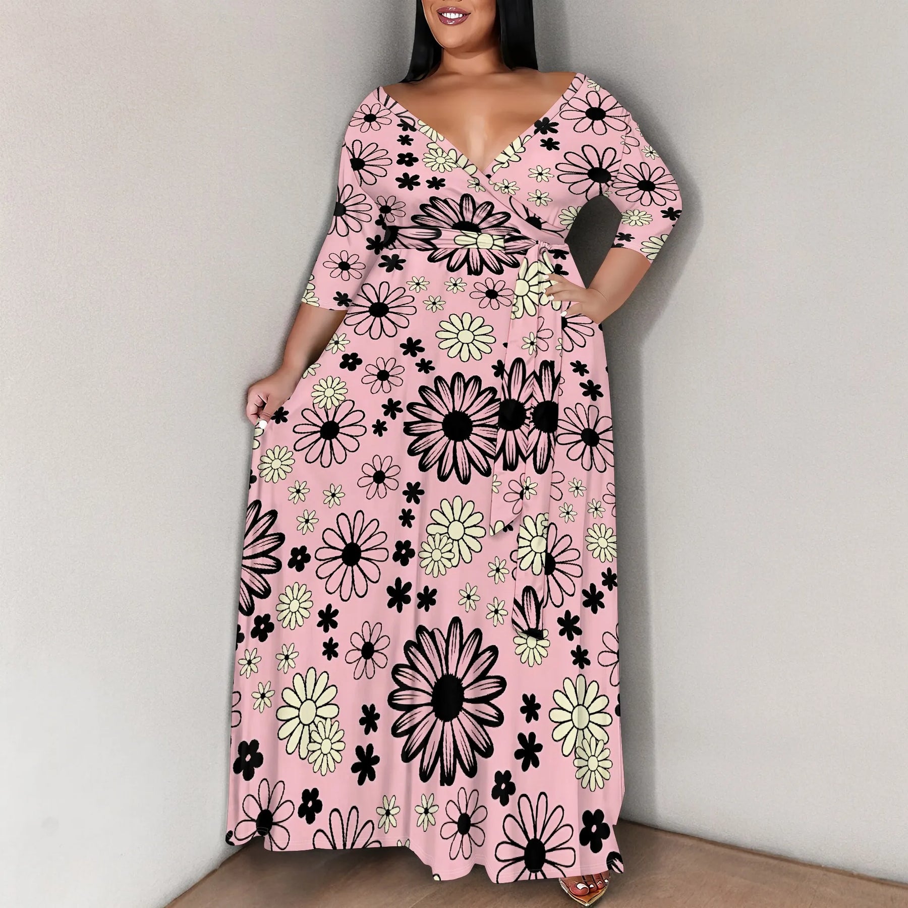 Plus Size Pink Floral Print Maxi Dress 3/4 Sleeve V Neck Belted A-Line Long Dress for Spring Vacation